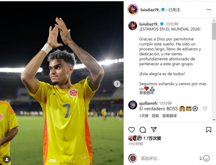 迪亚斯社媒晒出比赛照片,并写道:“我们晋级2026年世界杯!感谢上帝让我实现这个梦想。这是一段漫长而充满努力与奉献的历程,能成为这支伟大球队的一员,我深感荣幸。这份喜悦属于所有人!