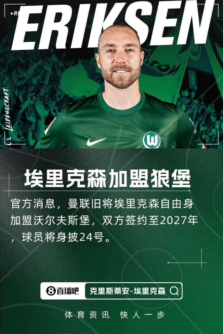 9月11日官方确认,前曼联中场埃里克森以自由球员身份正式加盟沃尔夫斯堡,合同期至2027年,他将身穿24号球衣。